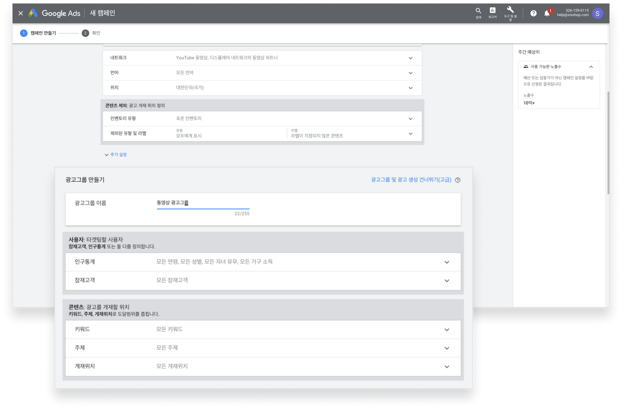사용자, 콘텐츠에 대한 설정은 '모든 사용자', '모든 콘텐츠'로 설정해 광고를 진행하는 것을 추천드립니다.