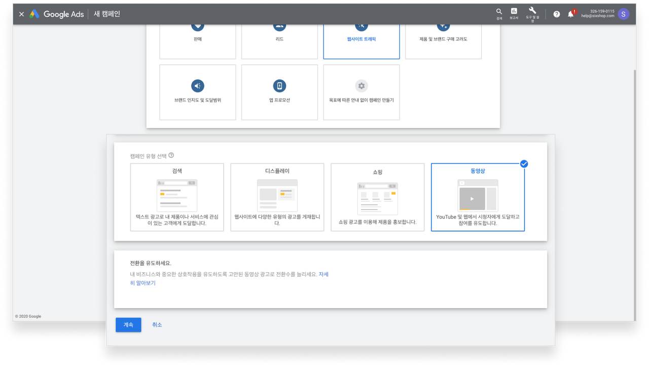 '동영상' 유형을 선택 후 '계속'을 눌러 다음 단계로 넘어갑니다.