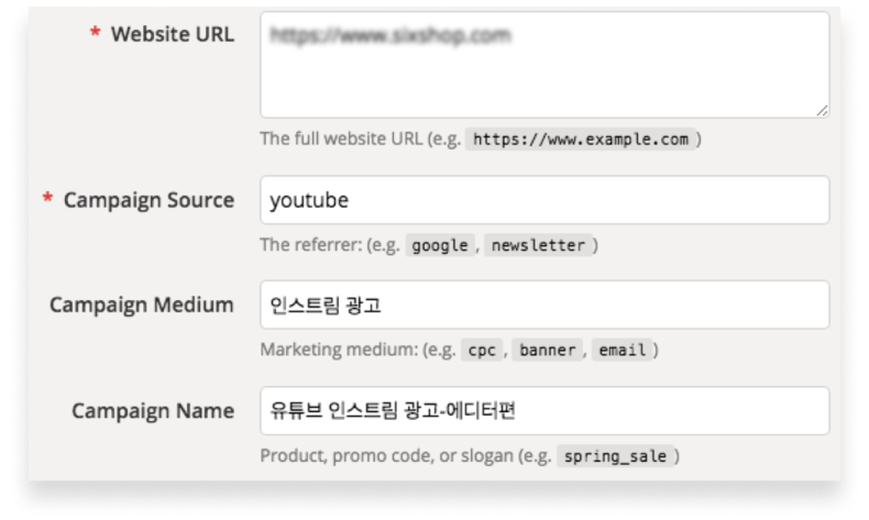 ※ 구글 URL 빌더는 구글 애널리틱스가 연결된 사이트 주소만 사용 가능합니다. 또한 도착 페이지가 내가 운영 중인 사이트 주소일 때만 사용하도록 합니다.