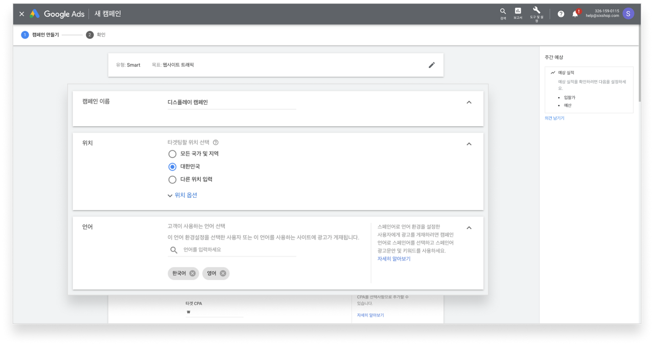 캠페인 유형 선택 후 캠페인 이름, 위치, 언어를 설정할 수 있습니다.