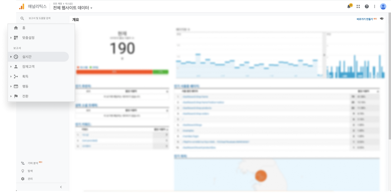 구글 애널리틱스에서 제공하는 보고서는 왼쪽에 사이드바 메뉴로 구성되어 있습니다. 이 메뉴를 통해 실시간, 잠재고객, 획득, 행동, 전환의 보고서 값을 확인할 수 있습니다. 각 보고서들을 클릭하면 세부 보고서들을 볼 수 있습니다.