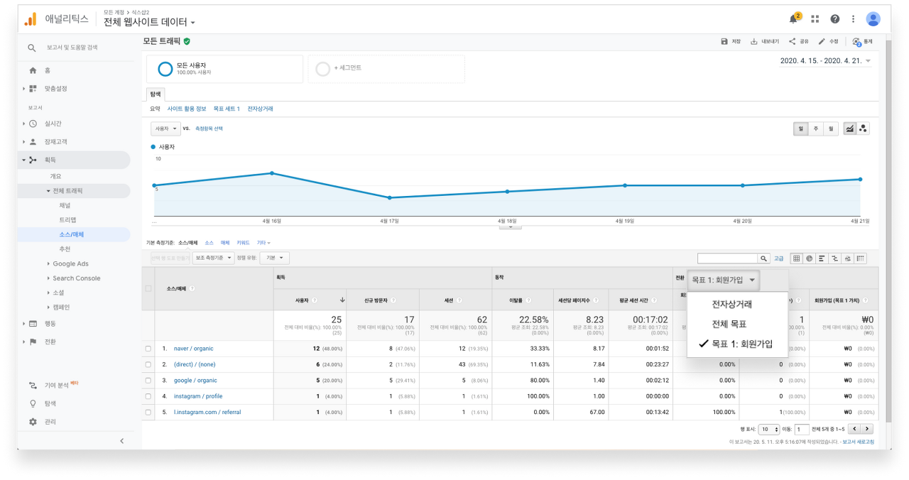 가입자 확인은 '전환' 열의 값을 설정해 놓은 회원가입 목표로 선택해 확인할 수 있습니다.