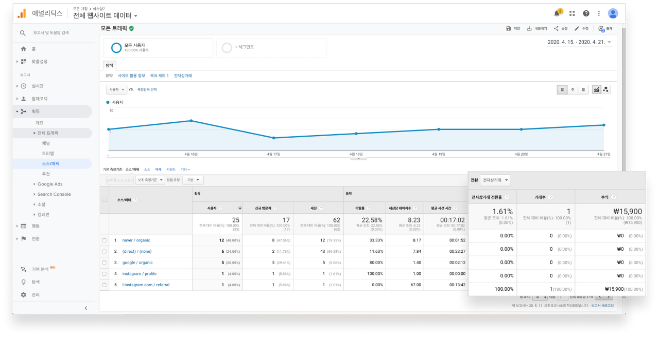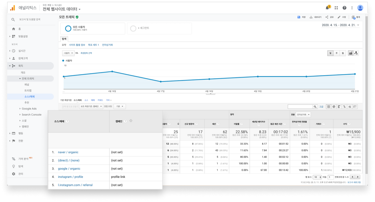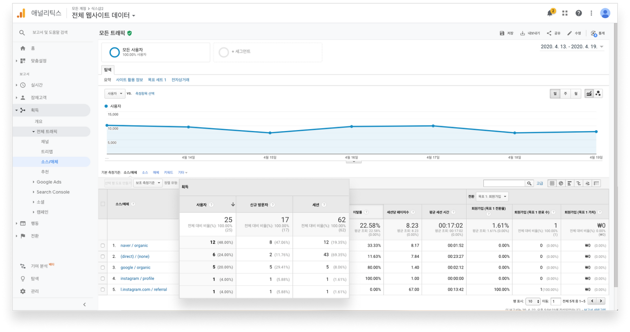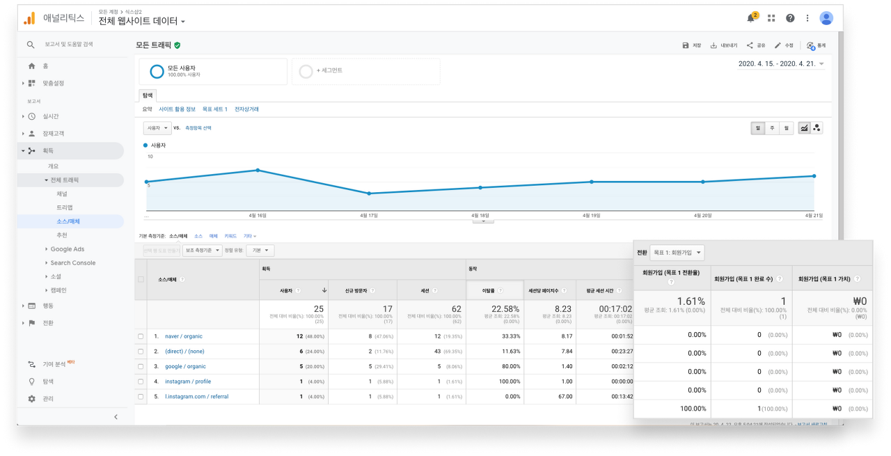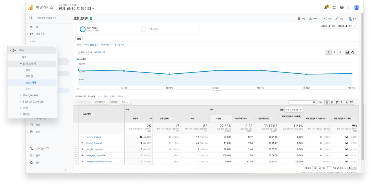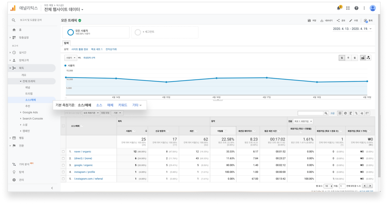 방문자 유입 경로 확인 웹사이트 사용자들이 어떤 채널 혹은 유입 경로를 통해서 웹사이트에 접속했는지 보여줍니다. 어떤 채널 혹은 소스와 매체에서 가장 많은 트래픽이 있었고, 가장 전환에 기여를 많이 했는지에 대해서 파악할 수 있기 때문에 매우 중요도가 높은 보고서입니다.