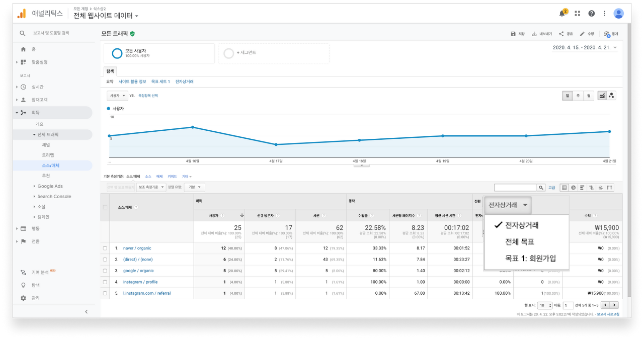 다양한 보고서 종류를 통해 필요한 성과를 분석할 수 있습니다. 그중 유입, 구매, 회원가입 등 매크로 전환(목표/전자상거래)의 다양한 기기, 채널을 통한 유입을 확인은 [획득 보고서 - 전체 트래픽 - 소스/매체]를 통해 가능합니다.