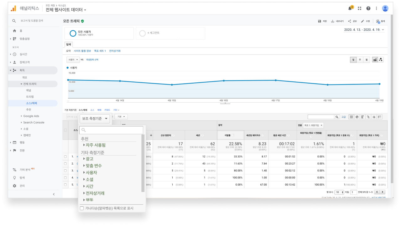 기본, 보조 측정기준을 모두 선택 후 '획득' 열을 통해 사용자, 신규 방문자, 세션을 확인할 수 있습니다.
