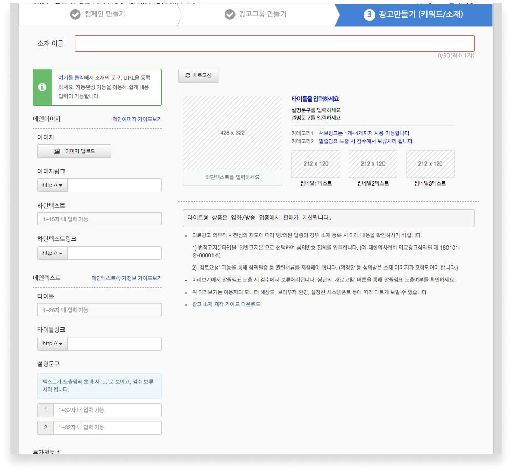 '광고그룹 만들기' 단계에서 선택한 상품 유형(템플릿)에 맞춰 이미지/동영상, 텍스트 및 링크 URL을 입력합니다.