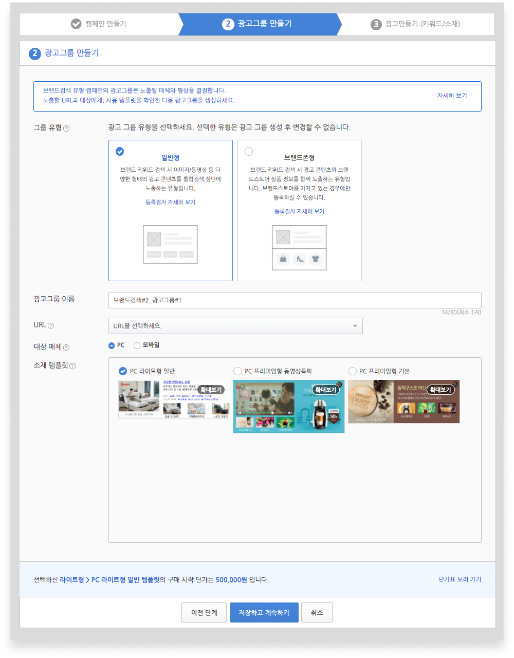 광고그룹 단위로 노출 매체와 상품 유형(템플릿)을 선택할 수 있습니다. '광고그룹 이름'과 'URL'을 입력하고 광고를 노출할 매체와 상품 유형을 선택합니다.