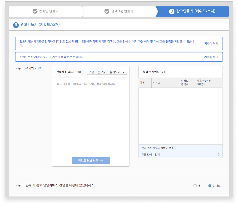 마지막 단계로 광고로 노출될 키워드와 소재를 등록합니다.