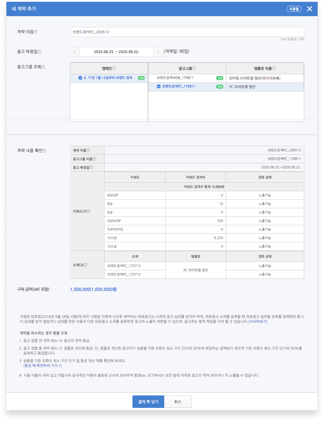 '새 계약 추가' 팝업에서 계약 이름, 광고 예정일을 입력하여 계약 내용을 확인한 후 '구매 금액 확인' 버튼을 클릭합니다.