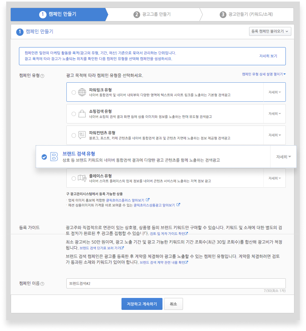 새로운 광고시스템을 통해 브랜드검색 광고를 등록할 수 있습니다. 광고 만들기는 캠페인과 광고그룹, 광고(키워드/소재) 만들기의 3단계로 진행됩니다.