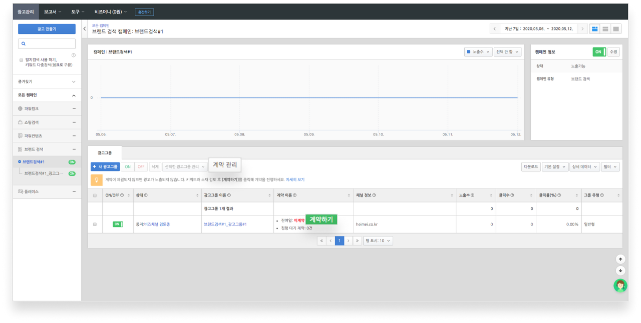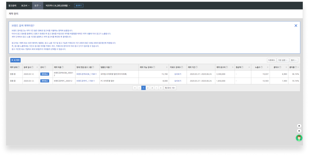 브랜드검색 계약하기는 ‘광고관리’ 또는 ‘계약관리’ 메뉴에서 진행할 수 있습니다.