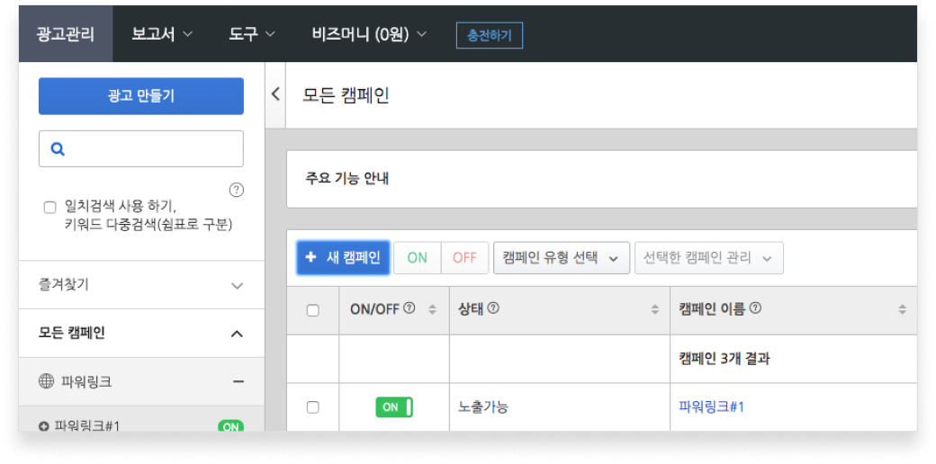 1. 광고시스템의 '광고관리' 메뉴에서 캠페인을 선택합니다.