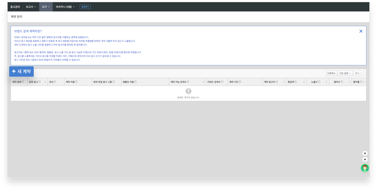 브랜드검색 계약하기는 ‘광고관리’ 또는 ‘계약관리’ 메뉴에서 진행할 수 있습니다.