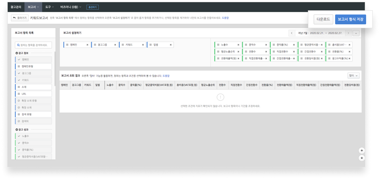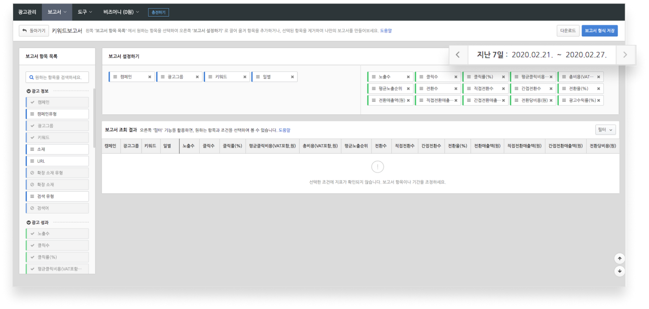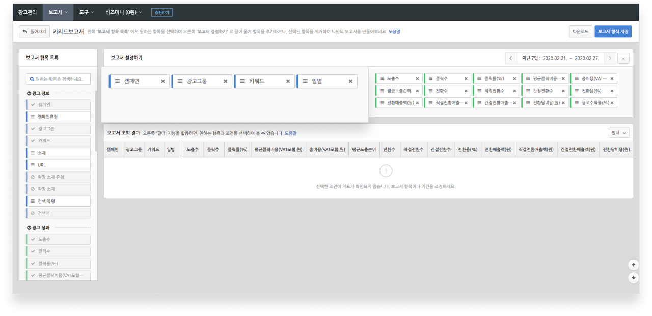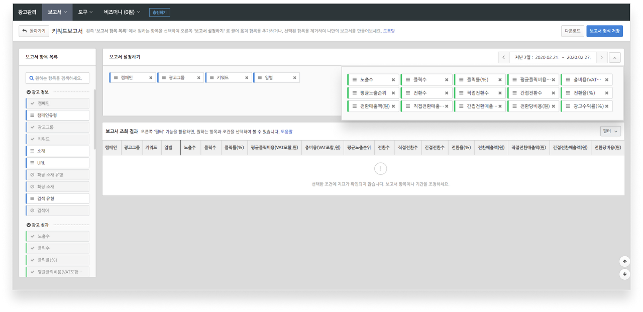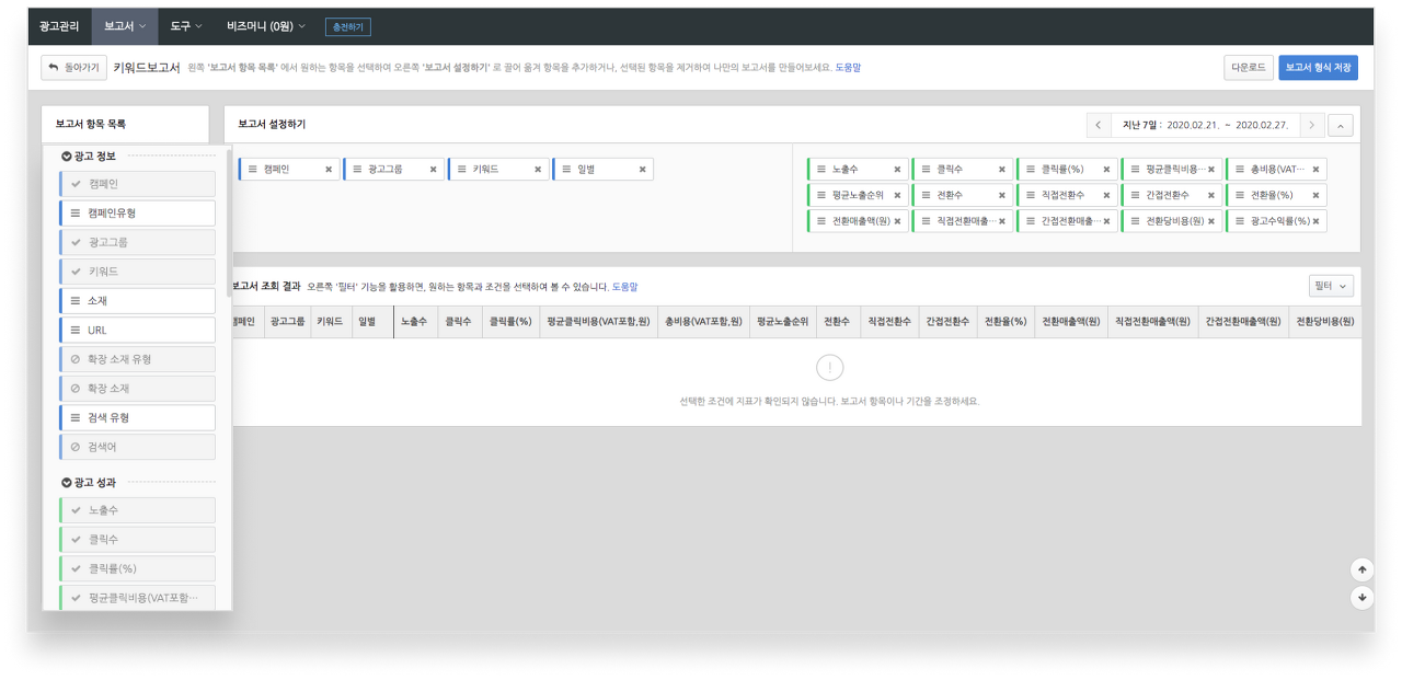 '보고서 설정하기' 좌측은 광고 정보 항목만 위치할 수 있습니다.