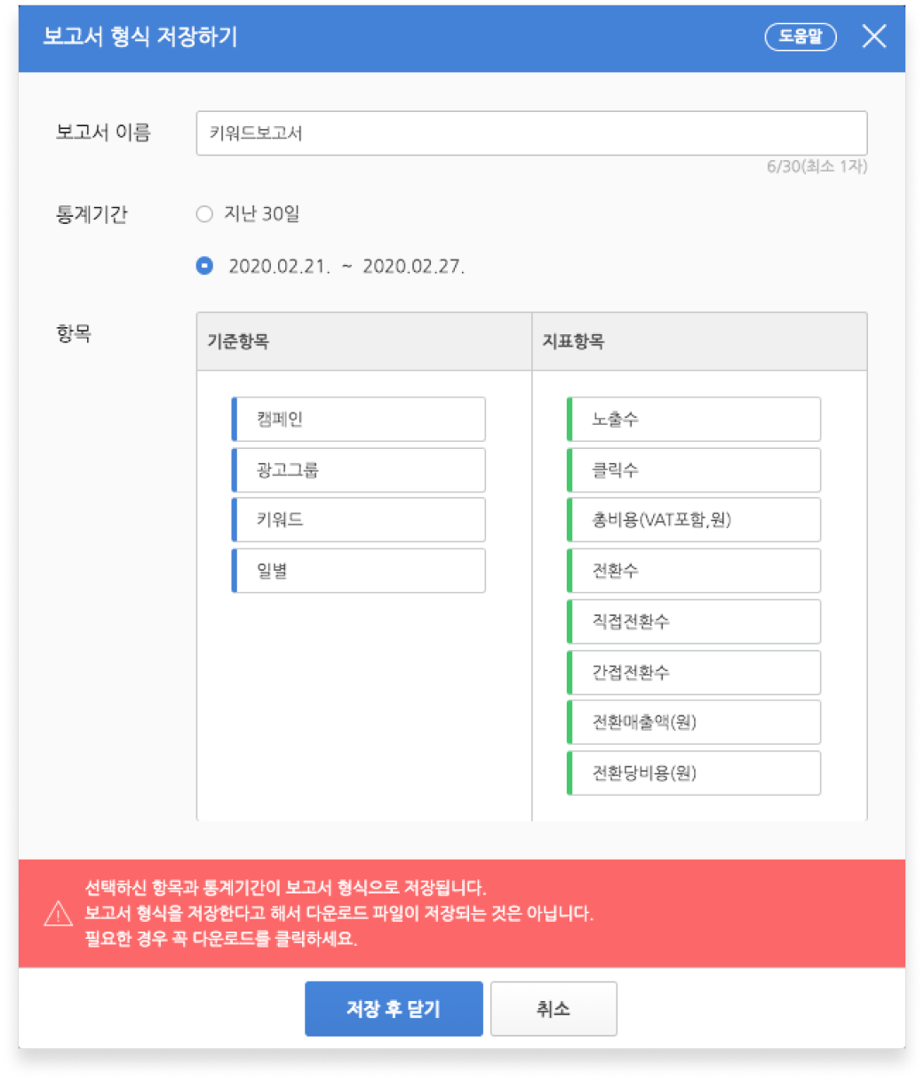 매번 보고서 설정을 하는 것이 번거롭다면 '보고서 형식 저장'을 통해 설정해놓은 보고서 값을 저장합니다. 저장된 보고서는 다차원 보고서 페이지에 목록으로 저장됩니다.