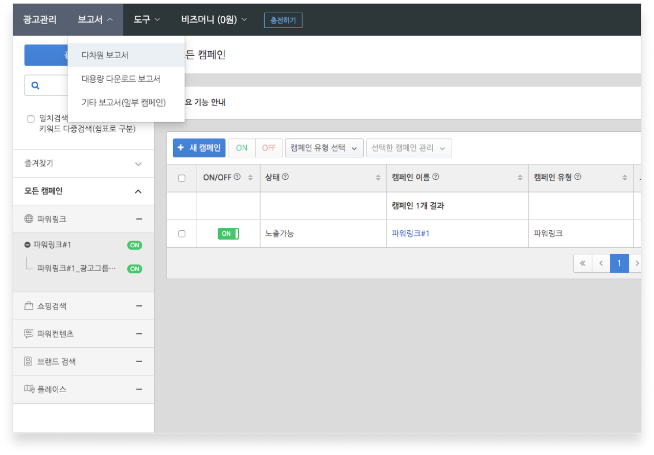 1. 광고시스템 메뉴 중 '보고서'의 '다차원 보고서'를 선택합니다.