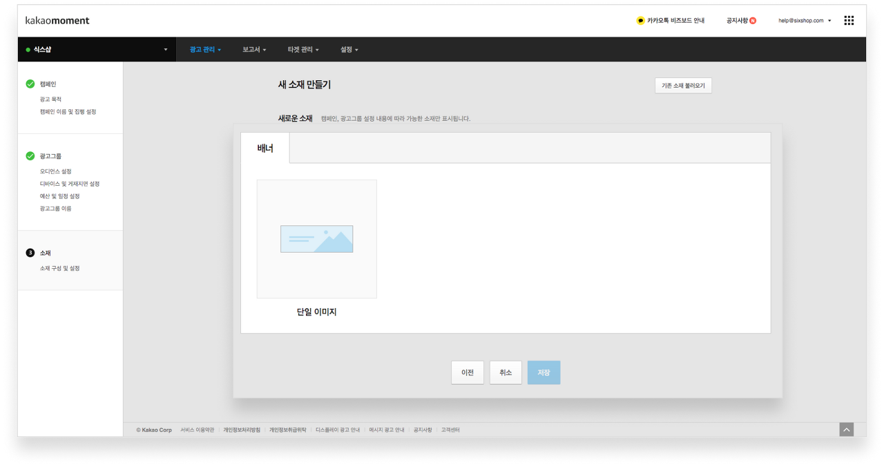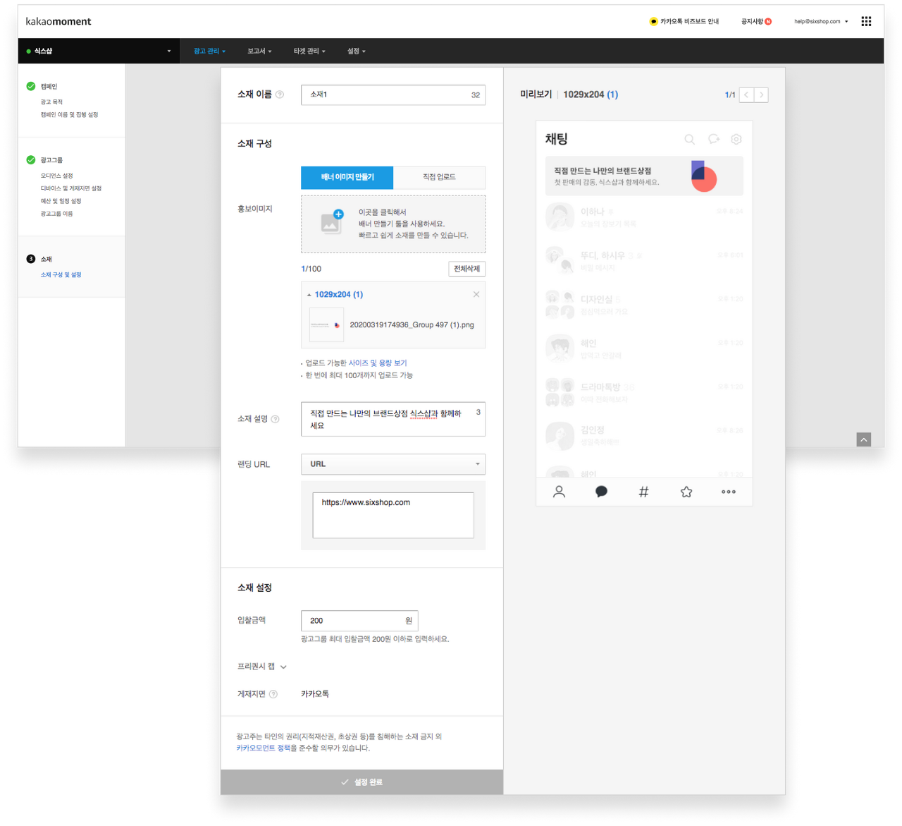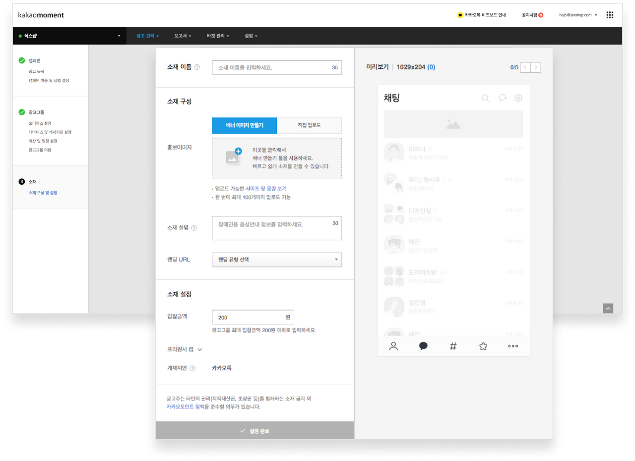 캠페인의 광고 목적에 따라 소재 형식을 정하고 나면 소재 이름, 홍보 이미지, 설명, 랜딩 URL, 입찰금액 등을 설정할 수 있습니다.