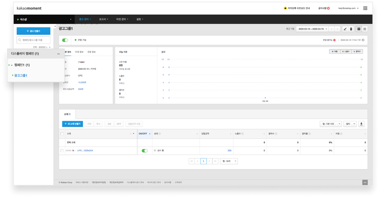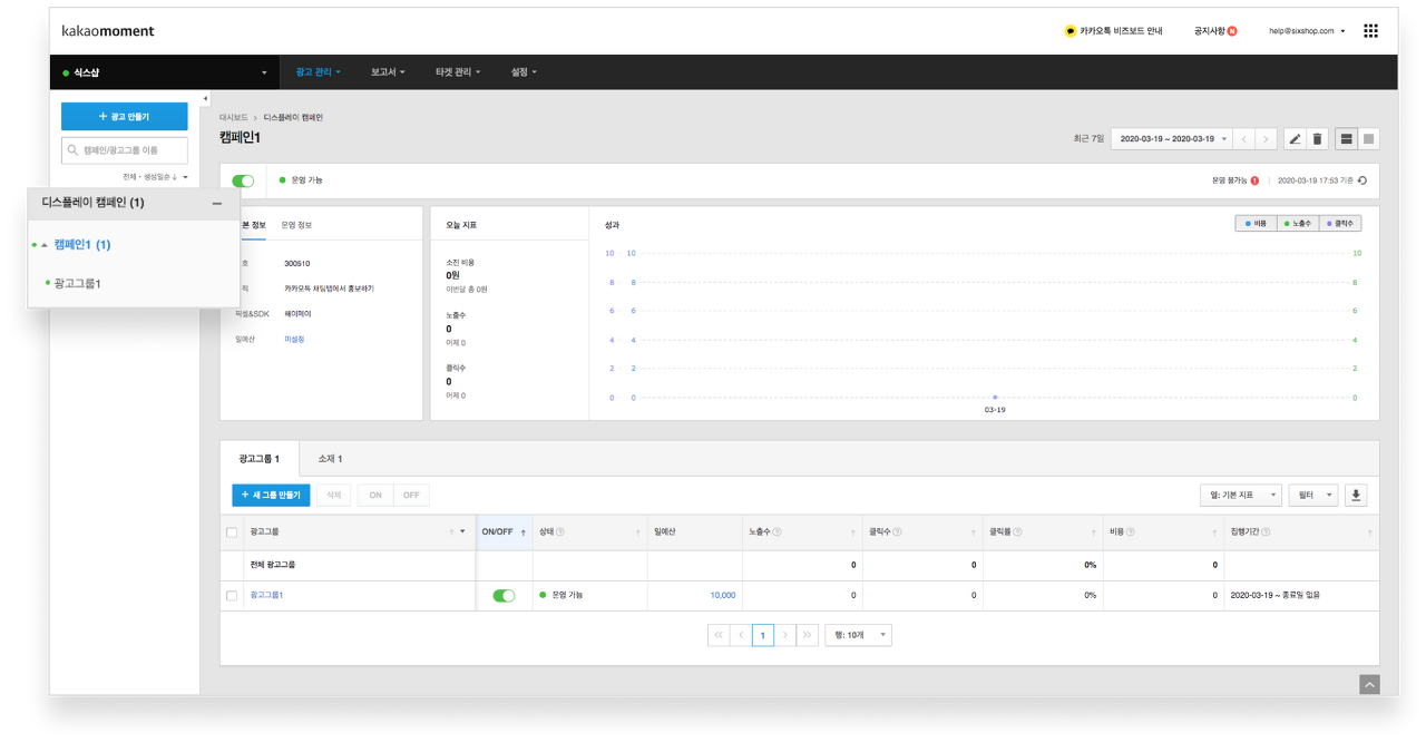 생성 완료된 캠페인, 광고그룹, 소재는 광고 관리자 메인 페이지에서 확인할 수 있습니다. 특정 캠페인을 선택하면 해당 캠페인 하위에 있는 광고그룹 목록이 보이며, 광고 그룹을 선택하면 그 하위에 있는 소재를 볼 수 있습니다.