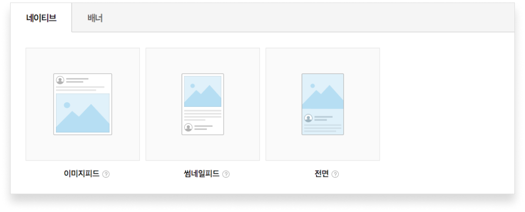 광고 소재 만들기 단계에서는 광고그룹에 포함될 소재(이미지, 문구)를 설정하게 됩니다. 추가할 수 있는 이미지는 네이티브, 배너, 동영상의 종류가 있으며, 캠페인의 종류에 따라 선택할 수 있는 소재의 종류가 달라집니다.