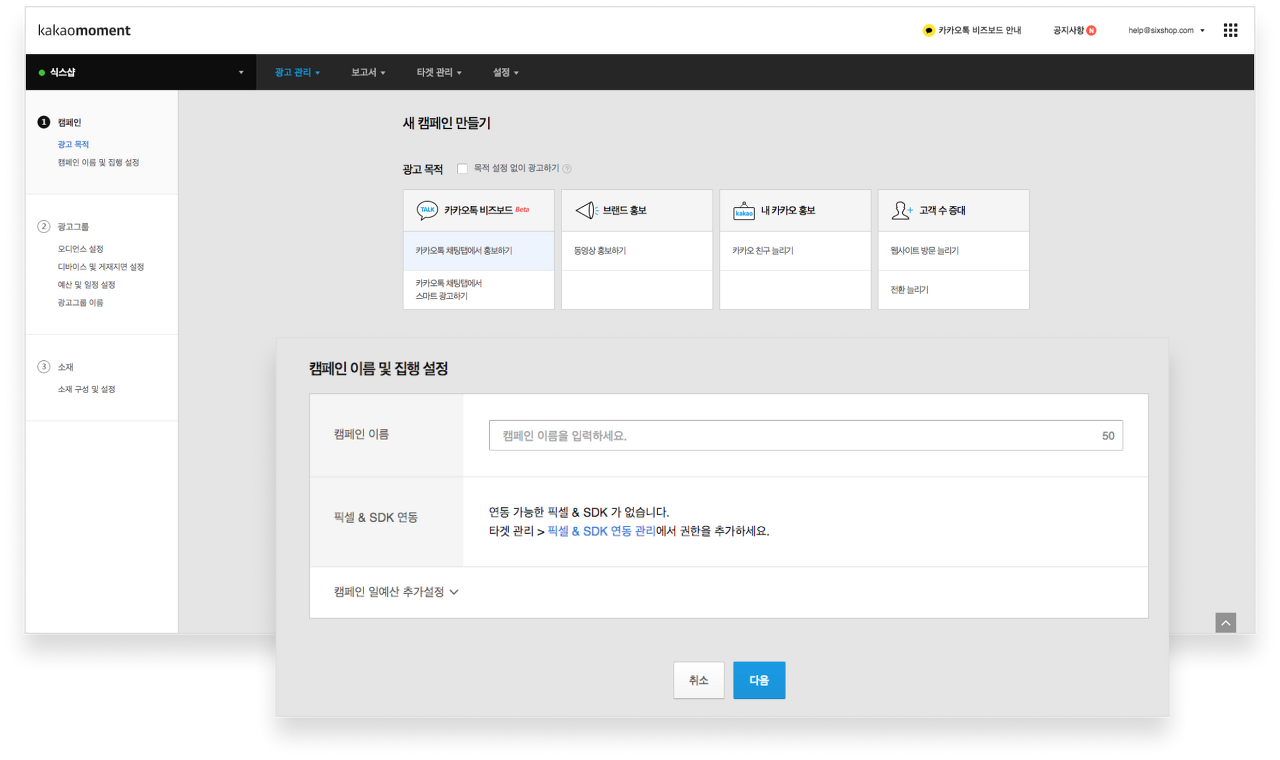 7. 픽셀 & SDK 생성 및 연동이 완료되었다면, 생성한 픽셀 & SDK값을 선택 후 '다음' 버튼을 통해 캠페인 생성을 완료하고 '광고그룹 만들기' 단계로 넘어갈 수 있습니다.