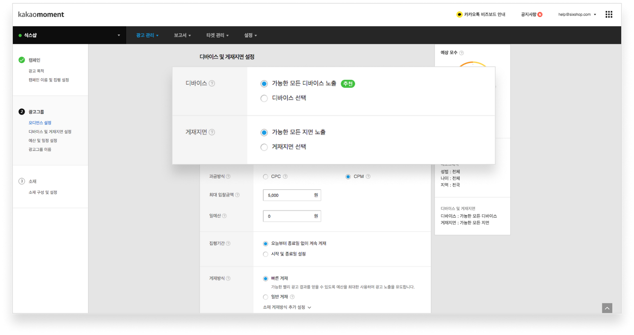 만약 광고에 특별한 전략 및 목적이 있다면 디바이스, 게재 지면을 선택하여 원하는 위치를 선택해주면 되지만 보통의 경우라면 '디바이스'는 '가능한 모든 디바이스 노출', '게재 지면'은 '가능한 모든 지면 노출'로 설정하는 것이 좋습니다.