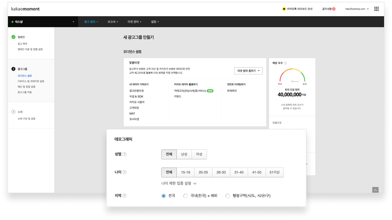 데모그래픽 카카오 데이터를 통해 제공되는 성별, 나이, 지역을 타겟으로 설정할 수 있습니다.