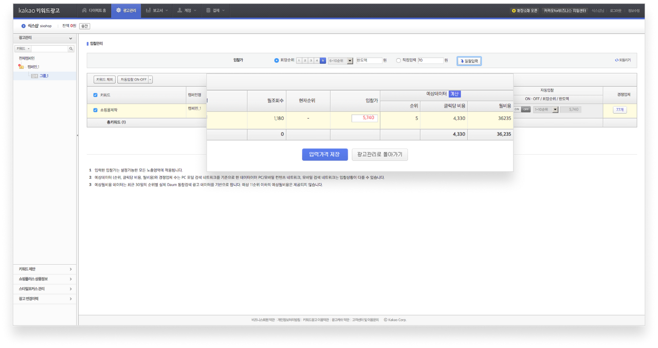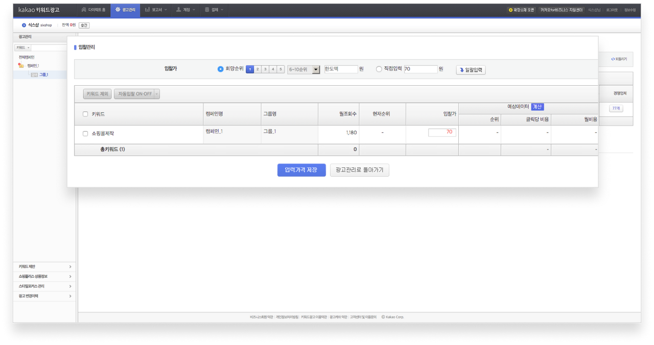 적용된 입찰가는 광고그룹 키워드 목록에서 확인 가능합니다. 자동입찰은 보통 1분~30분 내 반영이 되지만, 광고 시스템 내 전체 광고 변경 건에 따른 시스템 부하 정도에 따라 더 많은 시간이 소요될 수도 있습니다.