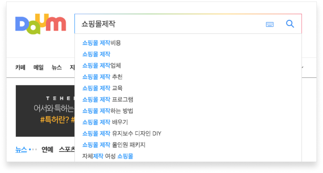 다음 검색창에 검색할 키워드를 입력하면 입력한 키워드를 포함한 다른 키워드들이 노출됩니다. 이를 자동완성 검색어라고합니다. 자동완성 검색어는 검색하는 사람의 검색량을 통해 생성되기 때문에 핵심 키워드가 포함된 다른 신규 키워드들을 확인할 수 있습니다.