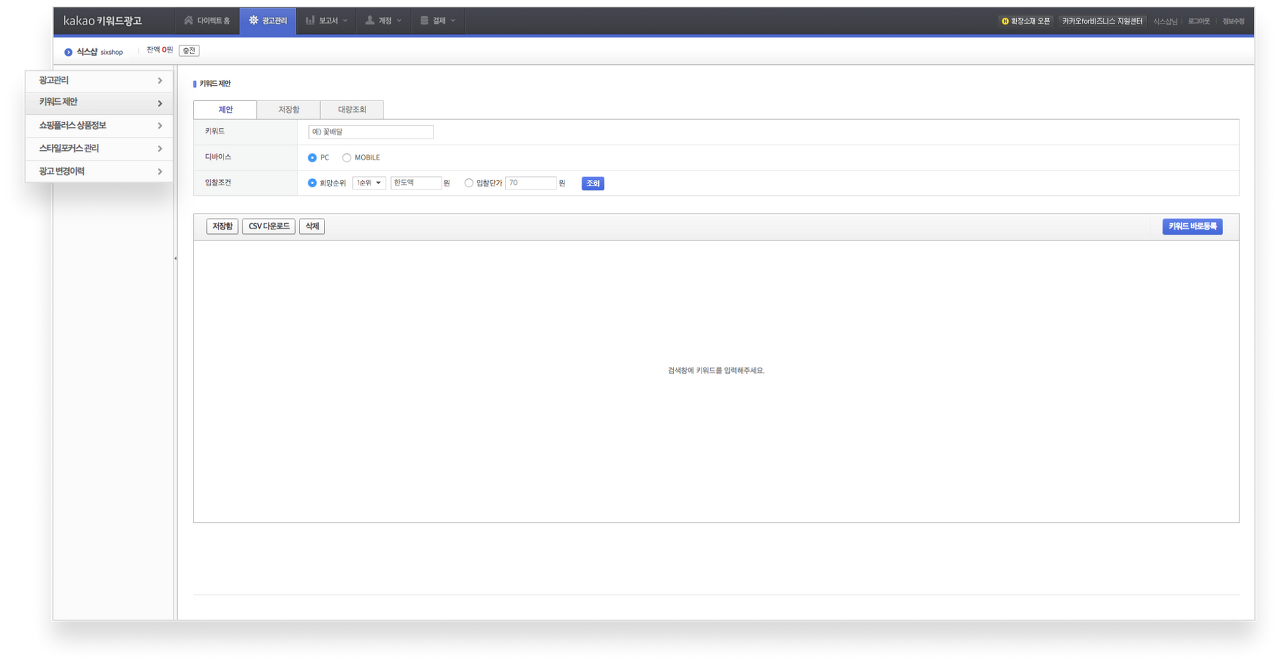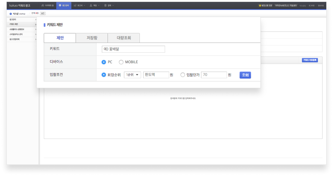다음에서 제공하는 키워드 제안를 활용하여 검색한 키워드와 연관이 있는 키워드들을 확인하고 내 키워드 광고에 추가할 수 있습니다. 좌측 메뉴 중 '키워드 제안'에서 사용할 수 있습니다.
