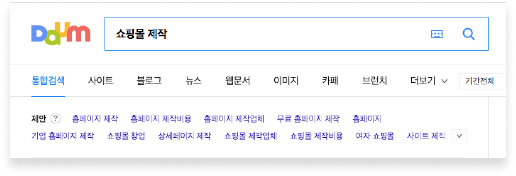 제안 검색어는 통합 검색 결과 최상단에 노출됩니다. 검색한 키워드와 연관이 있는 키워드만 노출되며, 여기서 말하는 연관이 있는 키워드의 노출 여부는 실제 검색하는 사용자의 검색 패턴을 통해 결정됩니다.