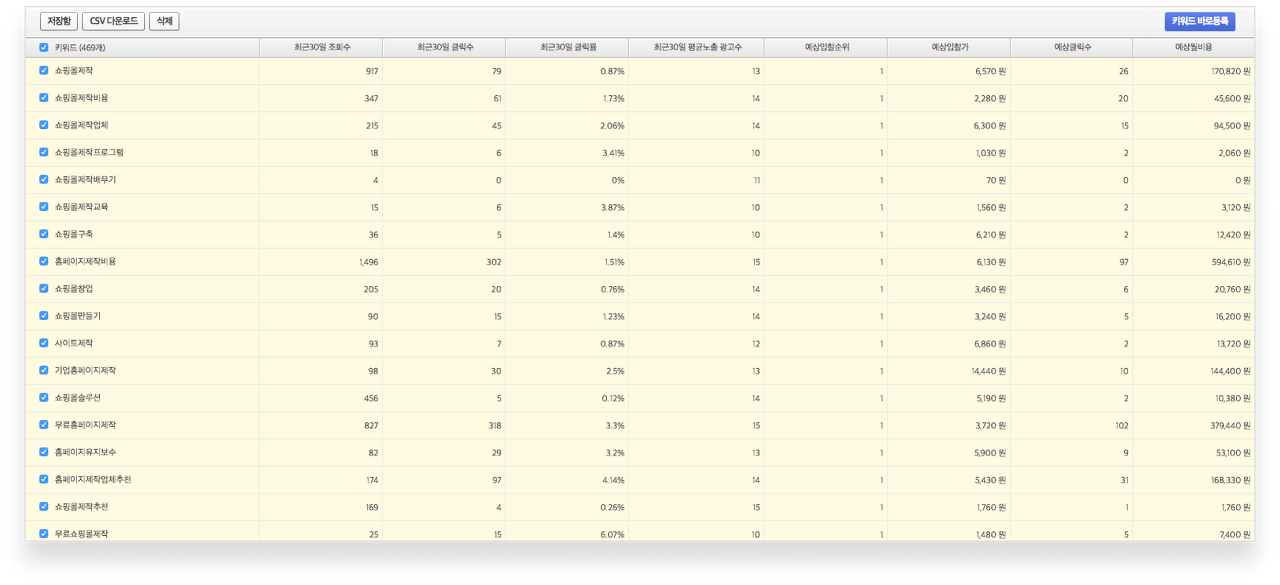 예상 입찰순위, 입찰가, 클릭수, 월비용 조회할 때 설정한 입찰가로 키워드를 추가했을 때 광고의 입찰 순위와 클릭수, 월비용의 예상값을 말합니다.