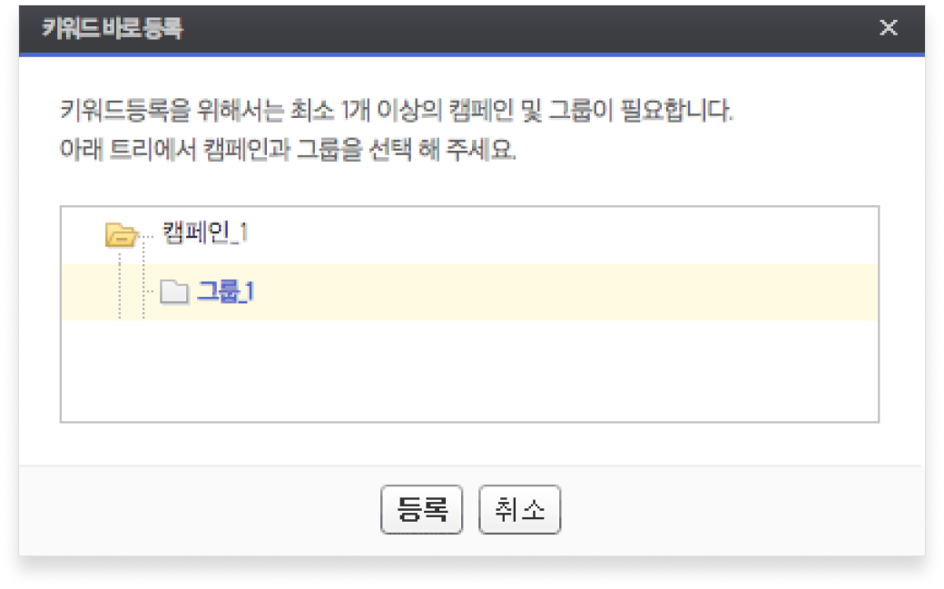 '키워드 바로등록'을 사용하면 어느 광고그룹에 키워드를 넣을지 선택하는 팝업이 출력되며, 이를 통해 원하는 광고그룹에 키워드를 추가할 수 있습니다.