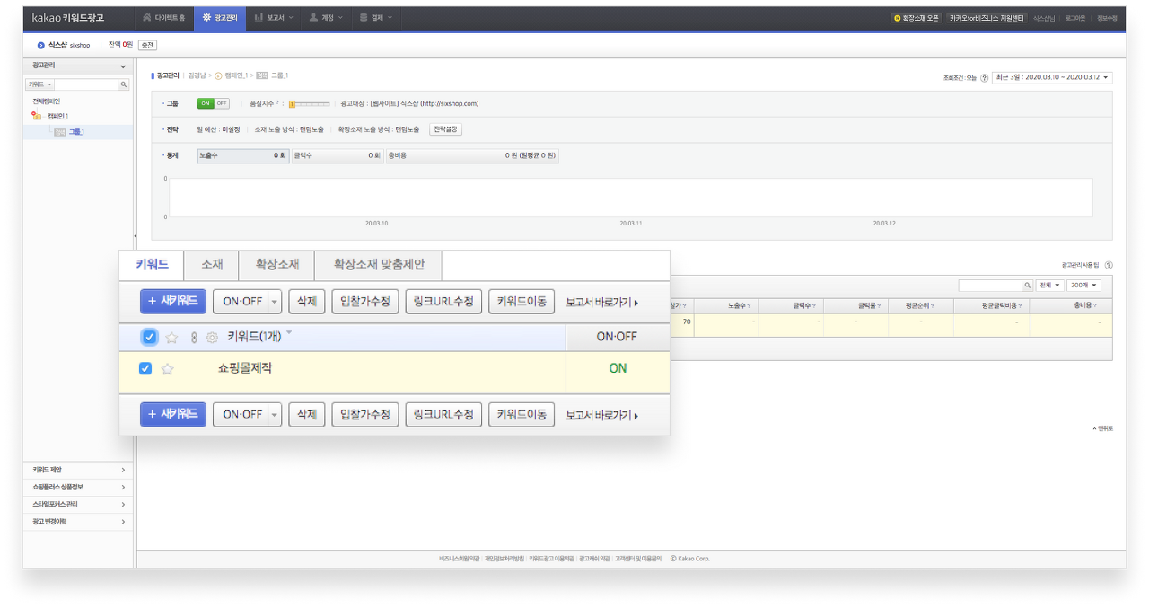 다양한 방식의 키워드 확장을 통해 생성한 키워드는 '광고관리''광고그룹'에서 '+ 새키워드'를 통해 추가 할 수 있습니다.